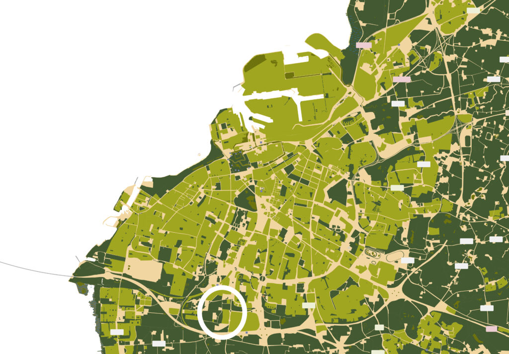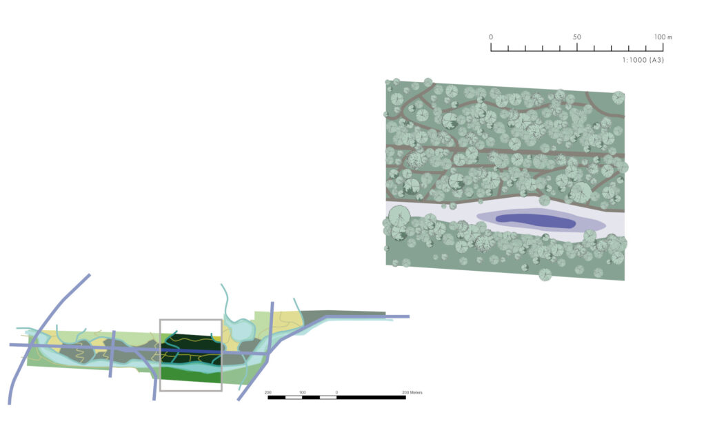 To the west of the project area, there is a district called Vintrie, to the south agricultural land, and to the east a small industrial area. The area slated to become the nature axis lies amidst agricultural fields. In the plan, the northern boundary of this axis will adjoin newly constructed residential areas. The current landscape is characterised by a narrow strip of greenery, featuring a ditch and a line of trees including elm, ash, oak, sycamore maple, and white willow. Surrounding this area are historical and cultural landmarks such as ancient farms, a mill, and a church. Additionally, the landscape bears traces of a former plant nursery, pollarded willows, and a defunct railway, which has been replaced by a diagonal path of salix.