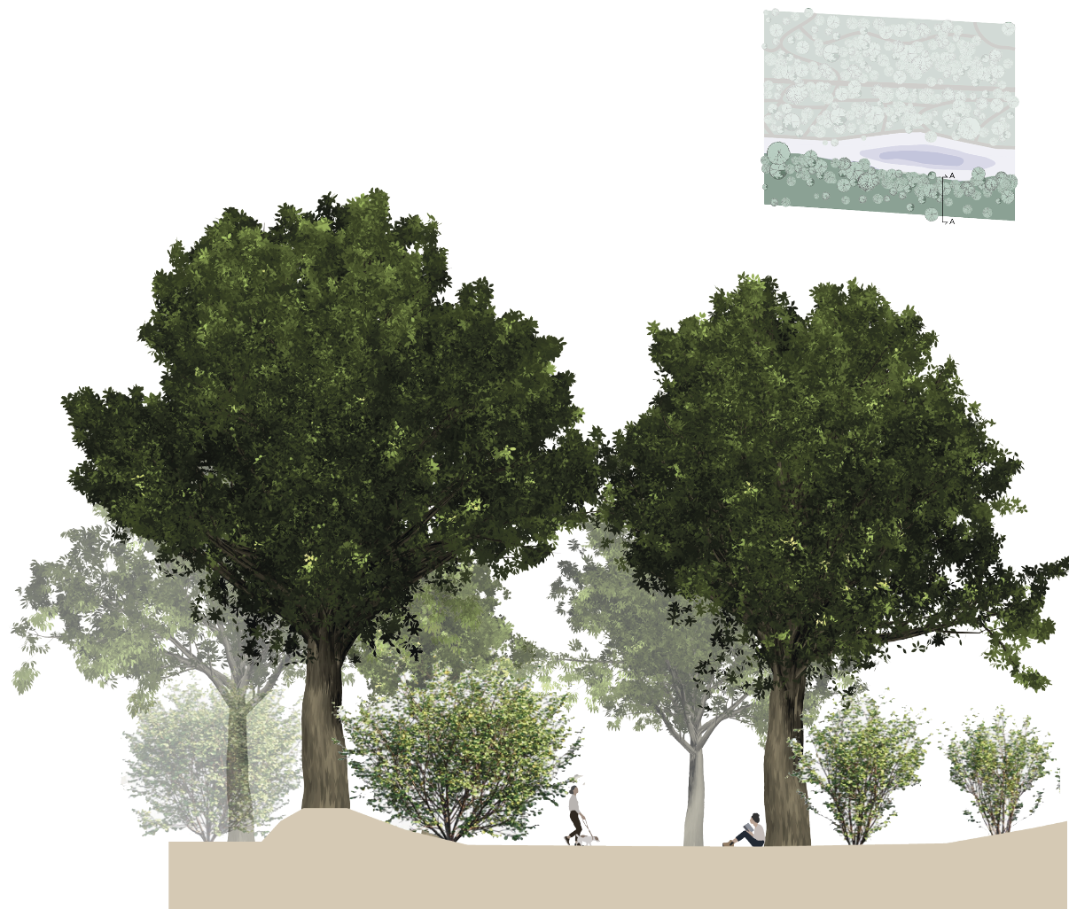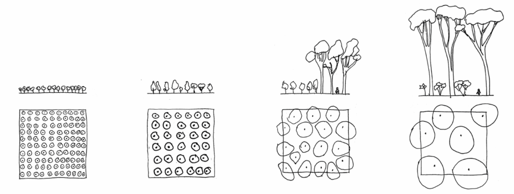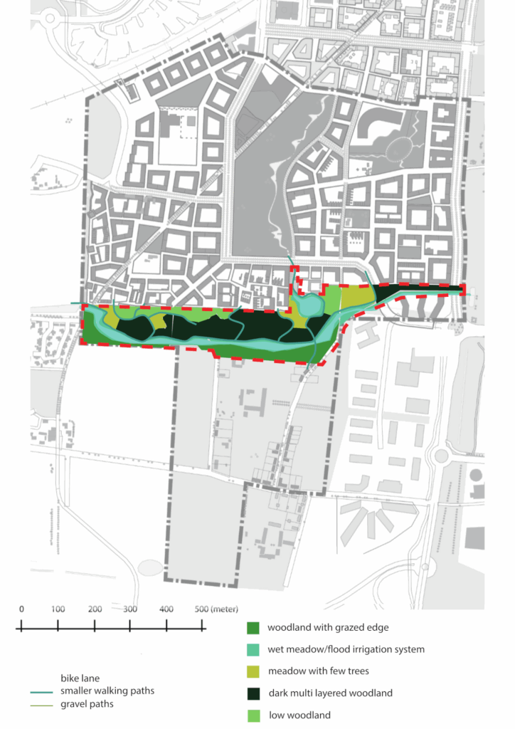 In the northern area, trees and shrubs will be densely planted (1.3-2 meters apart) to serve as a windbreak. Conversely, the southern area will see random tree placement (2-3 meters apart) to encourage broader and deeper tree crowns, resulting in a slightly more open structure and a density gradient.