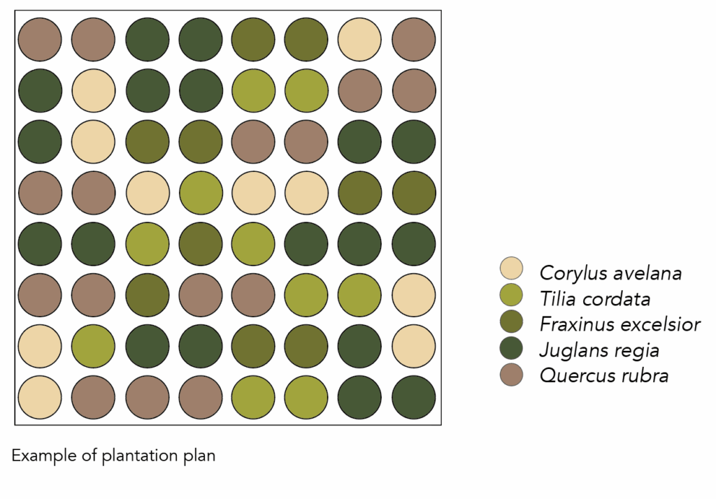 To create a diverse landscape, plant Quercus rubra and Juglans regia in rows 1.5 meters apart, with each plant spaced 1.5 meters apart. Alternate these species randomly, limiting consecutive plants of the same species to four. Intersperse Fraxinus excelsior or Tilia cordata every fifth tree, and Corylus, Crataegus spp, and Ribes alpinum every seventh plant. Mechanical weeding is advised for the first two seasons, followed by seeding Poa nemoralis and planting bulbs in the second autumn. Mix bulbs of Hyacinthoides hispanica, Scilla siberica, and Ornithogalum nutans at 50 bulbs per 10m².