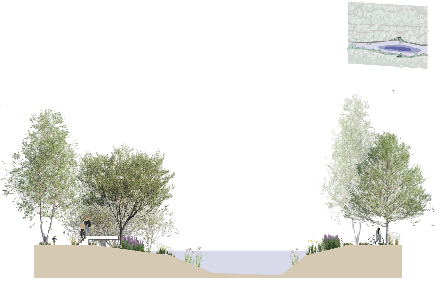 The wet meadow is sown with a seed mixture adjusted to moist conditions. Trees are planted in a scattered pattern with varying distances according to the planting plan.