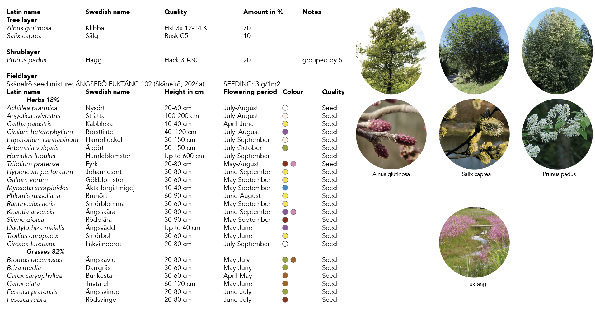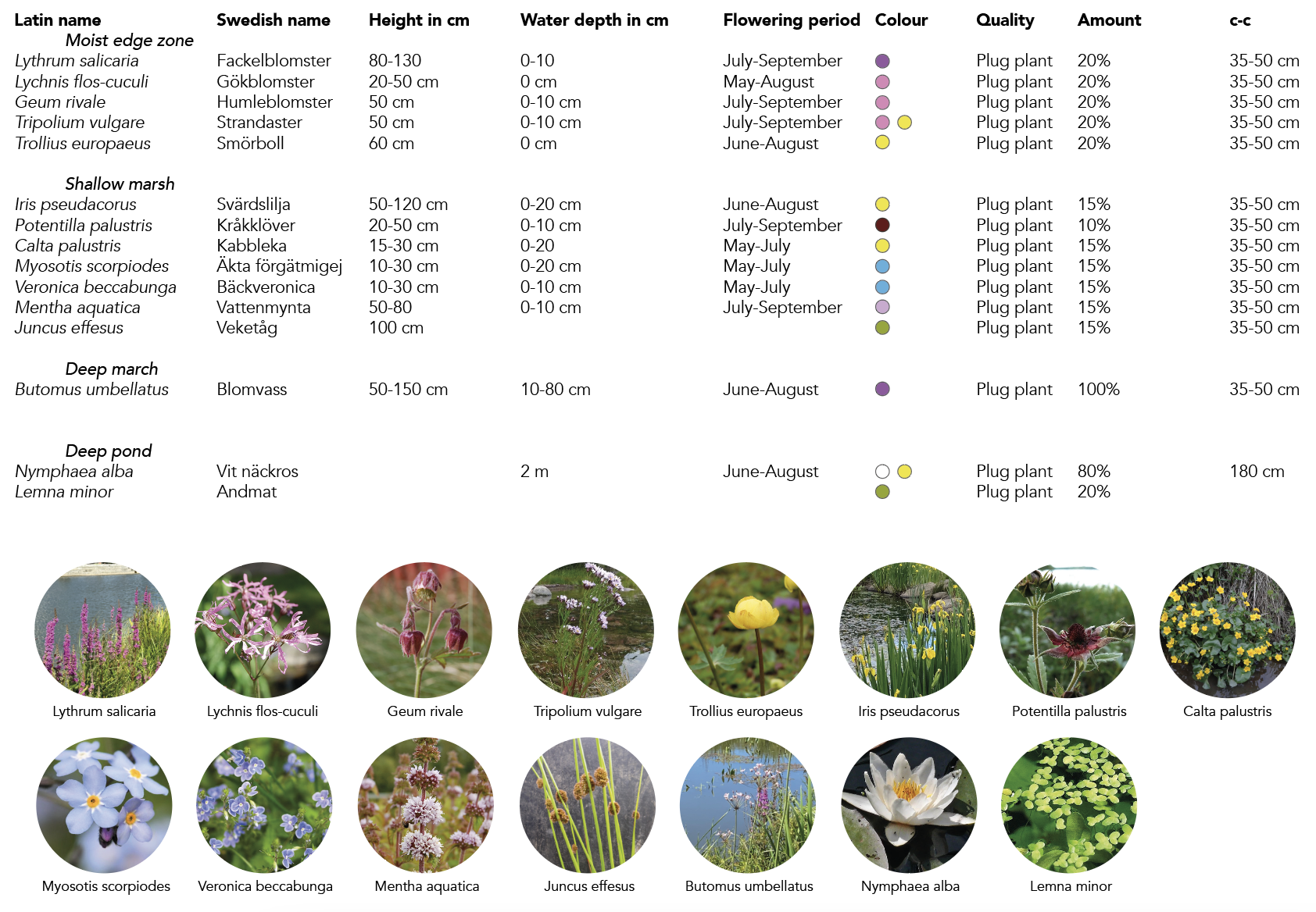 All selected species are tolerant of the moist and wet conditions of the biotope.