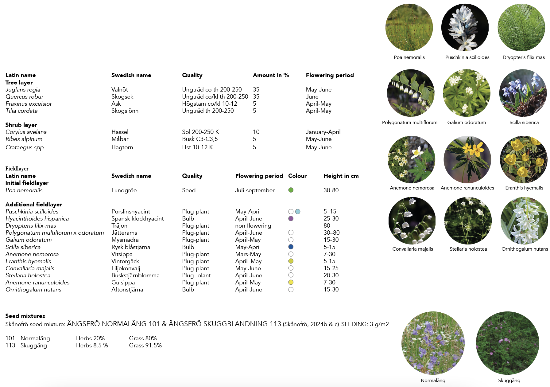Initially shade-tolerant grass, Poa nemoralis, is sown. The fieldlayer of herbs should be introduced after 10 years in connection to the second thinning. Herbs should be introduced as plug plants in a scattered patch pattern. The planting of the herbs should be congregated along the paths, glades and entrances.