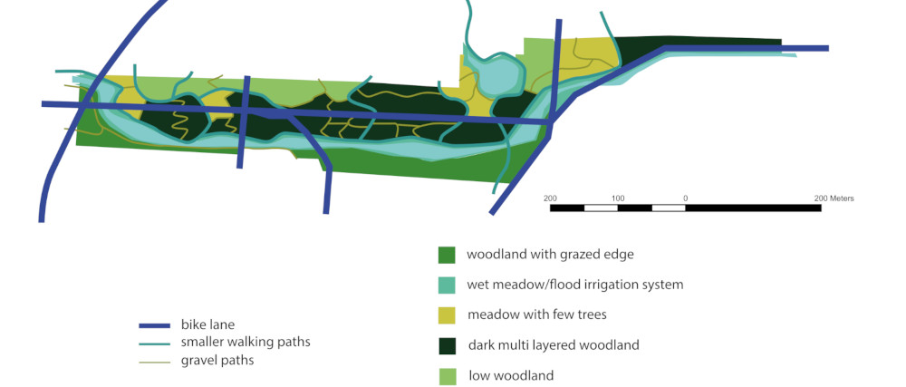 The first thinning, and should be concentrated to suppress species or Fraxinus excelsior, to minimize risk for spreading diseases as well as providing sufficient space for more dominant trees and shrubs. To reach the goal of dense woodland in the furthest north, towards a semi-open woodland structure, starting 50 meters from the wetland border, more harsh thinning will be done in this area.